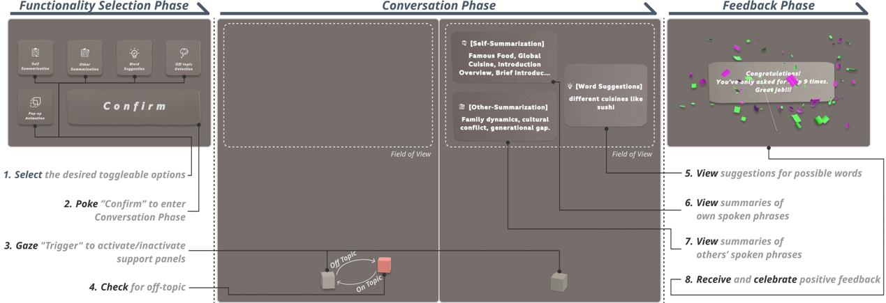 图1|Understood系统的完整交互流程概览。用户首先在功能选择阶段开启所需的辅助功能并确认进入对话。对话过程中,用户可通过注视触发区域激活或关闭支持面板,颜色变化提示当前是否偏离话题。面板激活后,系统将提供词语建议、自身发言摘要及对方发言摘要。对话结束后,用户将收到积极反馈以强化沟通信心。