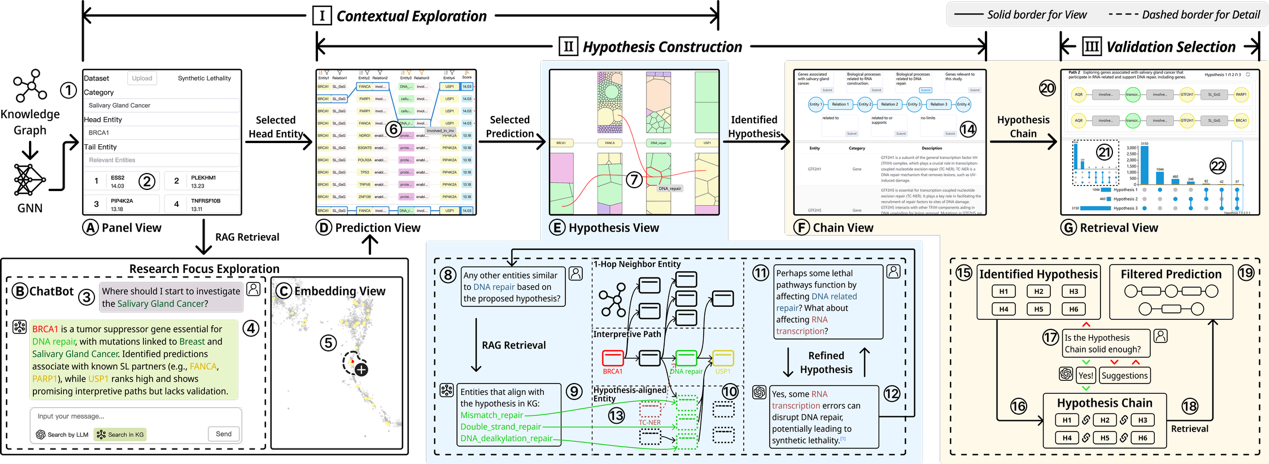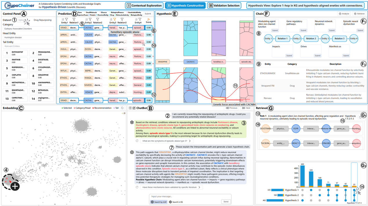 图5|HypoChainer通过融合专家知识、大语言模型与知识图谱的协作可视化系统,有效支持假设生成与验证,助力科学发现。