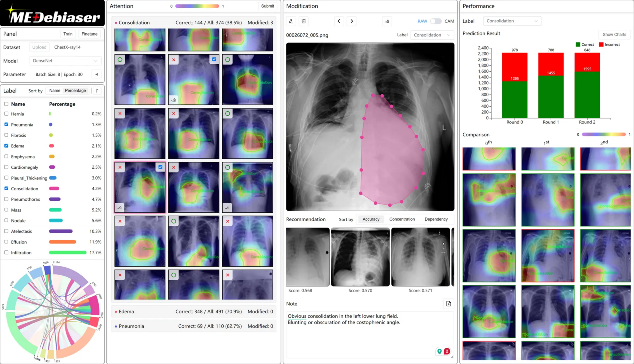 图3|MEDebiaser可视分析系统,旨在引导医生以其熟悉的方式直接修正AI模型的诊断偏见,提升模型准确性与可解释性,便利医生与工程师的合作。
