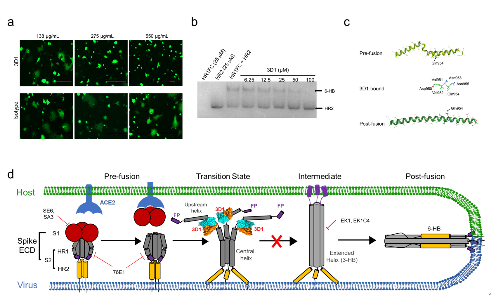 图2a. 刺突蛋白-hACE2介导的细胞膜融合实验;图2b. 3D1对SARS-CoV-2六螺旋束(6-HB)构象的剂量依赖性抑制;图2c. 3D1结合态HR1构象与不同融合态构象对比;图2d. 病毒刺突蛋白介导的膜融合示意图。