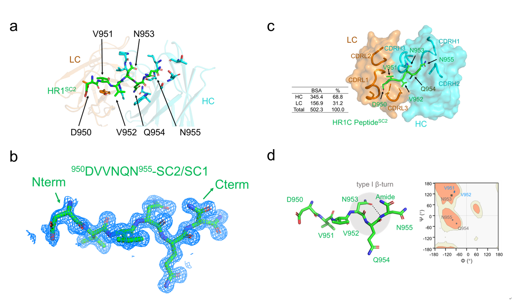 图1a. 3D1-肽段复合物整体结构;图1b. 肽段电子密度图;图1c. 重轻链界面互作;图1d. β转角结构特征