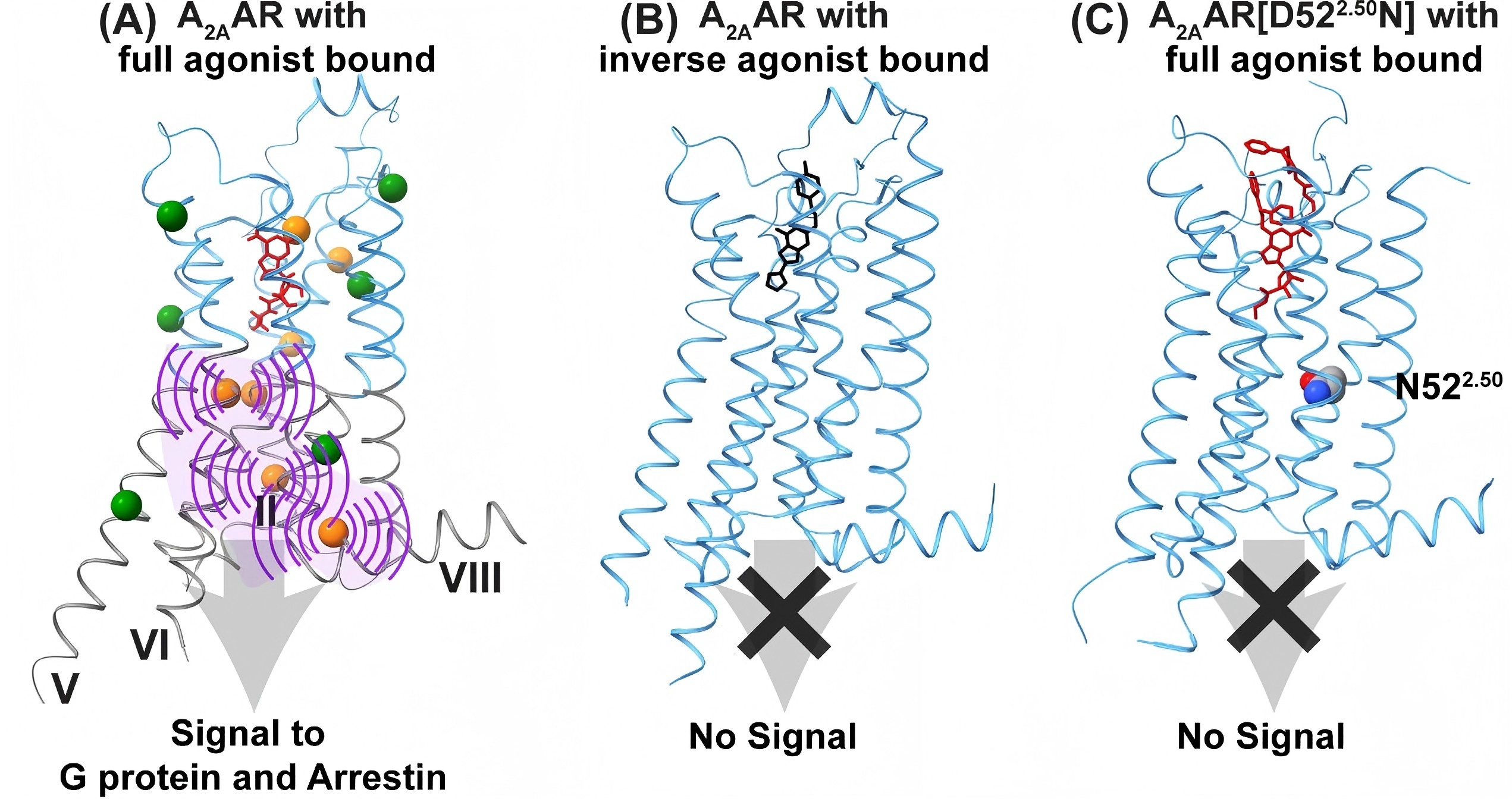 为破解这一难题,研究团队采用基因密码子扩展技术,在A2AAR中构建了一套对结构高度敏感的¹⁹F核磁探针网络(图1A),在原子水平追踪了跨膜区在配体结合中的构象变化,揭示了信号跨膜传递的结构基础。研究发现,受体对G蛋白与阻遏蛋白信号通路的无偏向性激活,与跨膜区胞内侧结构有序度的丧失密切相关(图1A和1B)。该过程由正构配体结合位点触发,通过别构效应远程传递。失活突变体A2AAR[D52N]的实验进一步验证了该机制:D52N点突变对A2AAR的晶体结构无明显影响,但消除了受体的信号活性并抑制跨膜区胞内侧结构有序度丧失(图1C)。