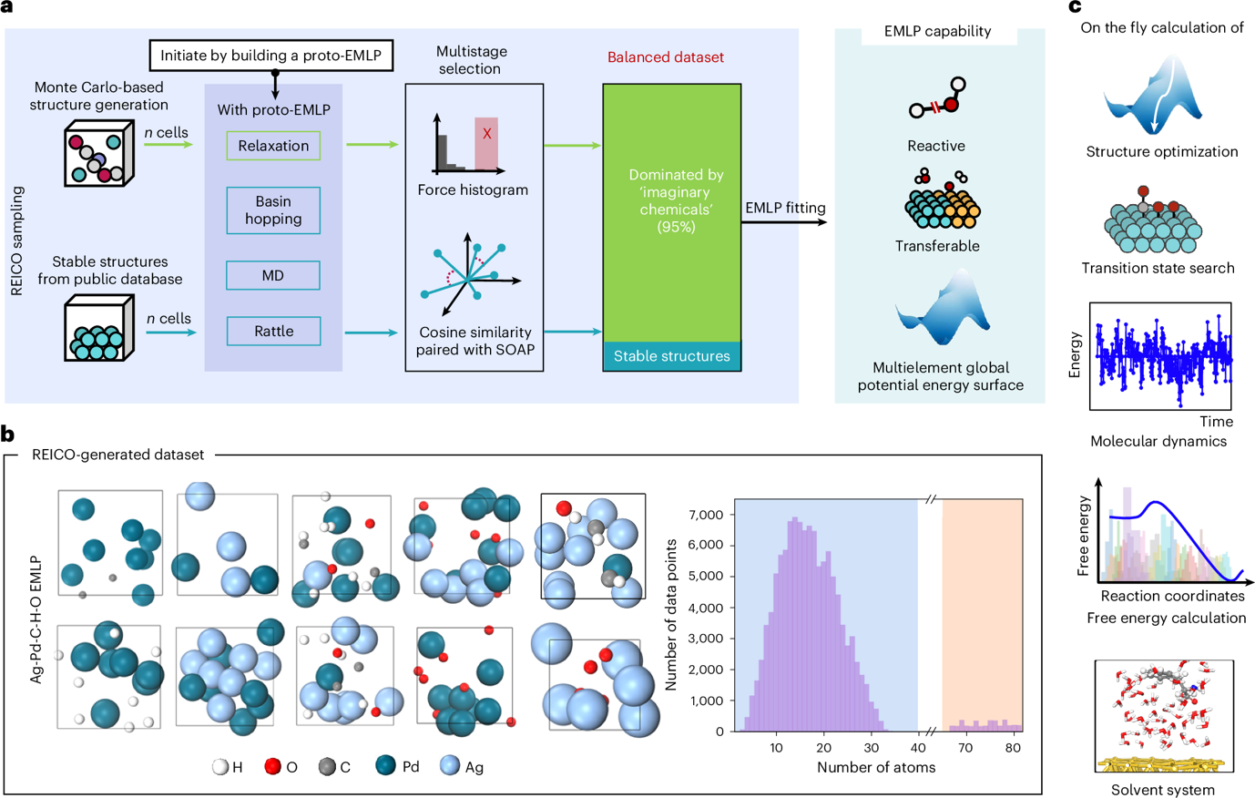 图1. EMLP 训练流程。其中RECIO方法中完全摆脱结构空间,专注于原子间相互作用训练集数据生成、元素基机器学习势函数(EMLP)训练流程以及训练出的势函数模型在多相催化中的应用。