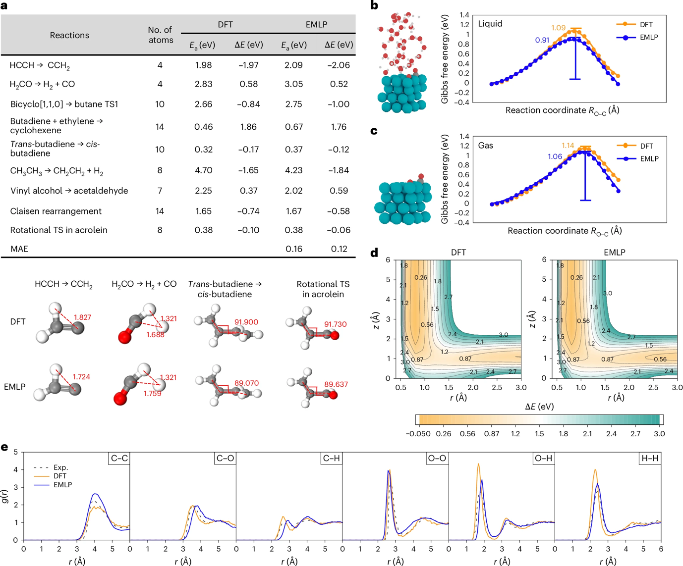 图2. EMLP可以广泛应用在各种化学体系中,实现了气固液多相体系的统一精确描述,超越了传统机器学习势函数的应用局限。EMLP不仅能准确预测多相催化反应,还能用于计算有机化学反应、表面动力学和溶液环境,展示了其真正的通用性。